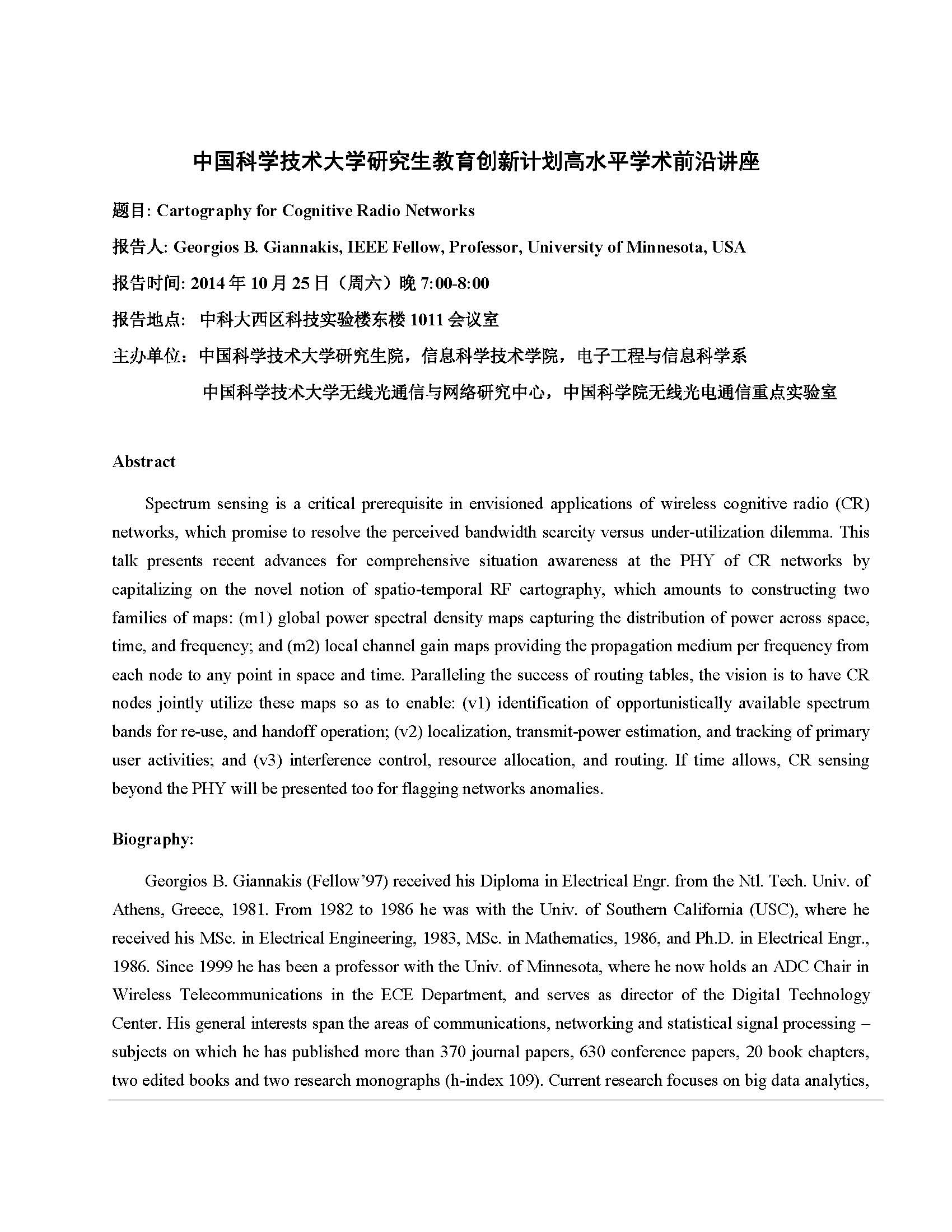 Professor Georgios B. Giannakis 学术讲座通知 谭勇_006 2014-10-24 220 内容搜索 最新内容 [2023-11-29]东南大学顾忠泽教授受邀作“器官芯片与人工智能融合的医药大模型... [2023-09-04]英国萨里大学王文武教授来访中国科技大学并做学术报告 [2023-09-03]电子科技大学顾实教授作高水平学术前沿讲座 [2020-10-04]电子科技大学孙胜教授来校交流并做学术报告
